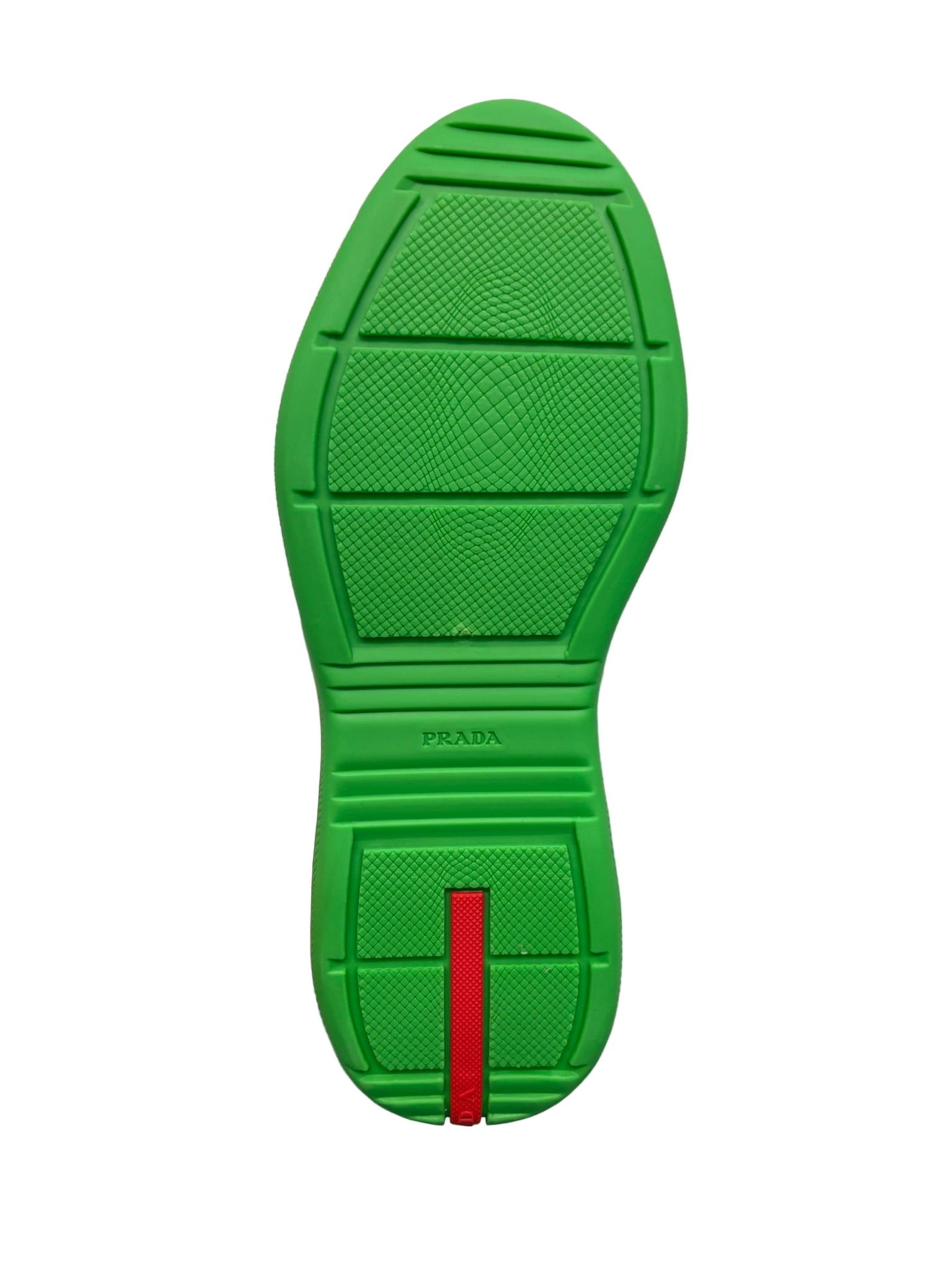 Confectionnées avec un mélange de panneaux lisses et de mesh technique aéré, ces baskets offrent confort, respirabilité et un style haut de gamme incomparable. L'empeigne vert vif contraste avec les lacets blancs et le logo rouge emblématique de Prada sur la languette , conférant à cette paire une allure contemporaine et audacieuse.