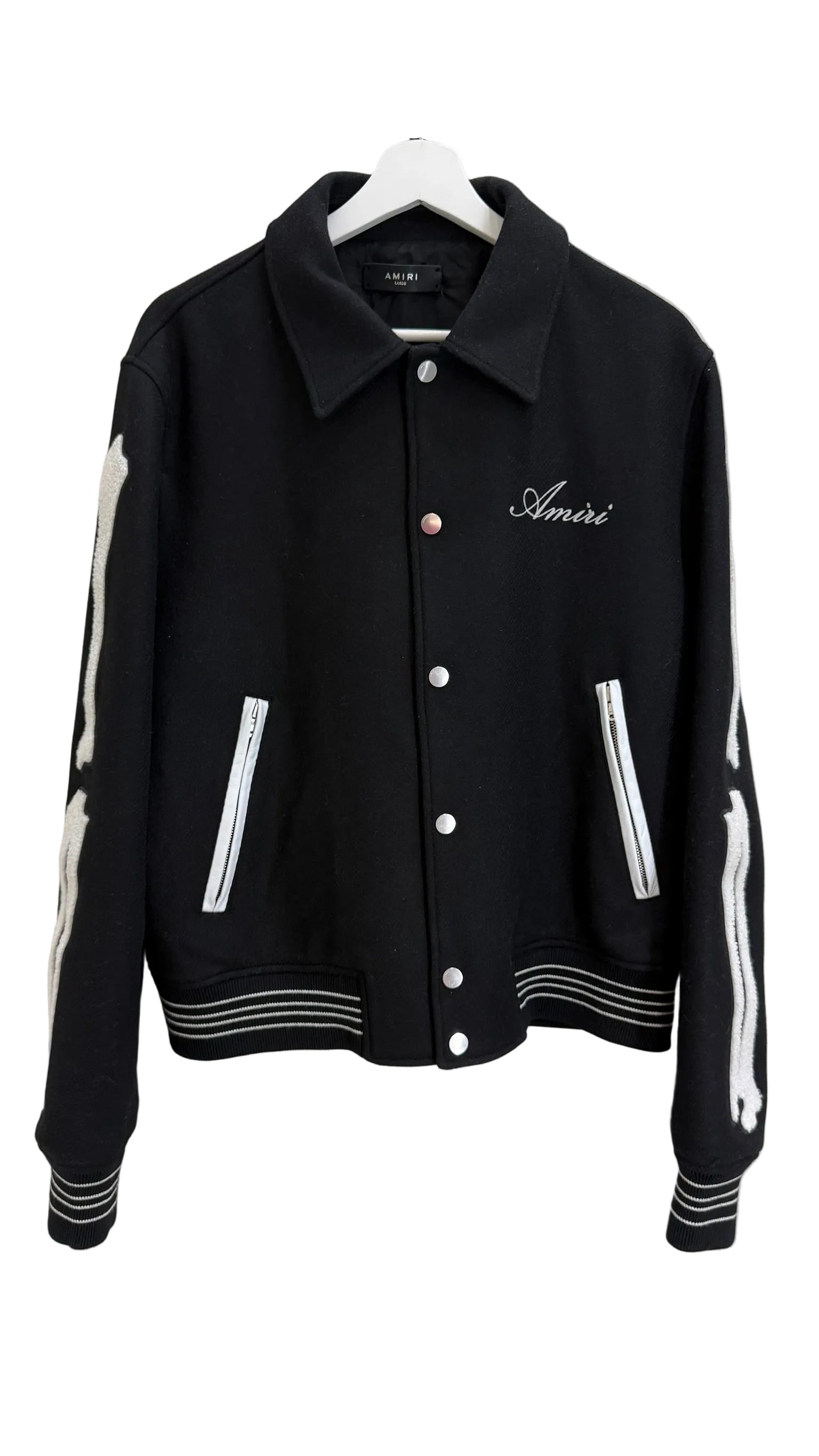 A standout outerwear piece from AMIRI, this black varsity jacket combines classic American varsity styling with the brand’s signature rock-inspired luxury aesthetic. Crafted with premium materials and sharp detailing, it delivers both statement appeal and everyday wearability.
