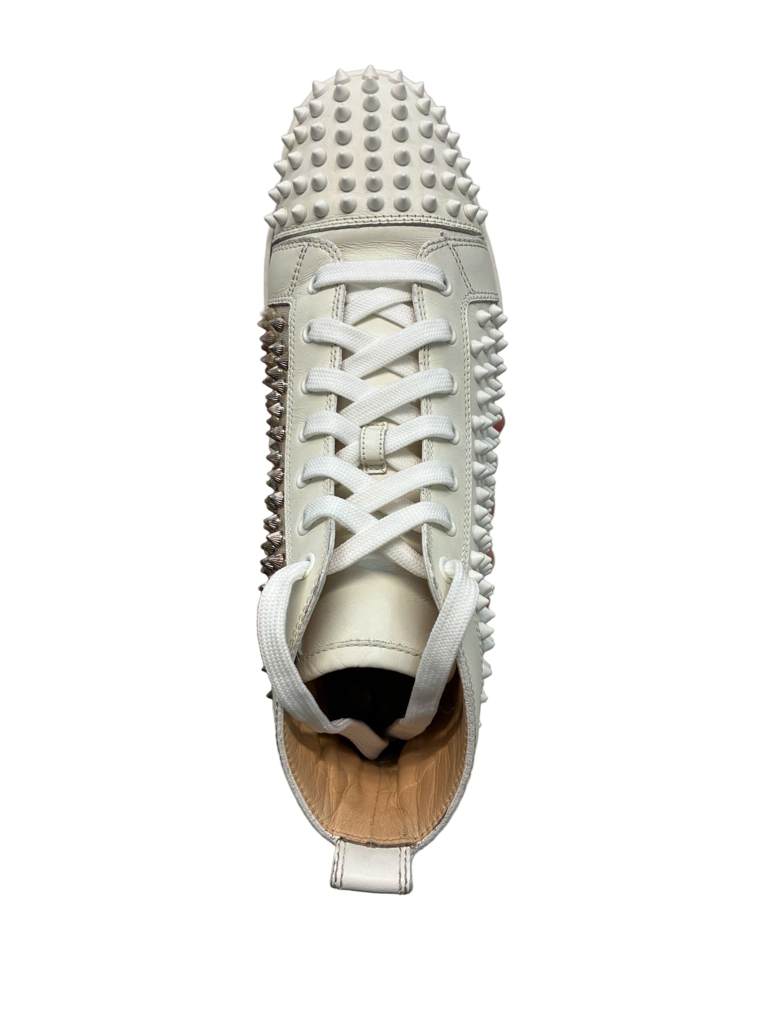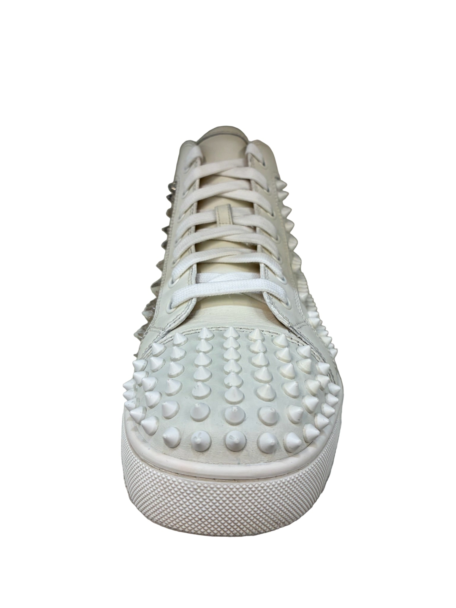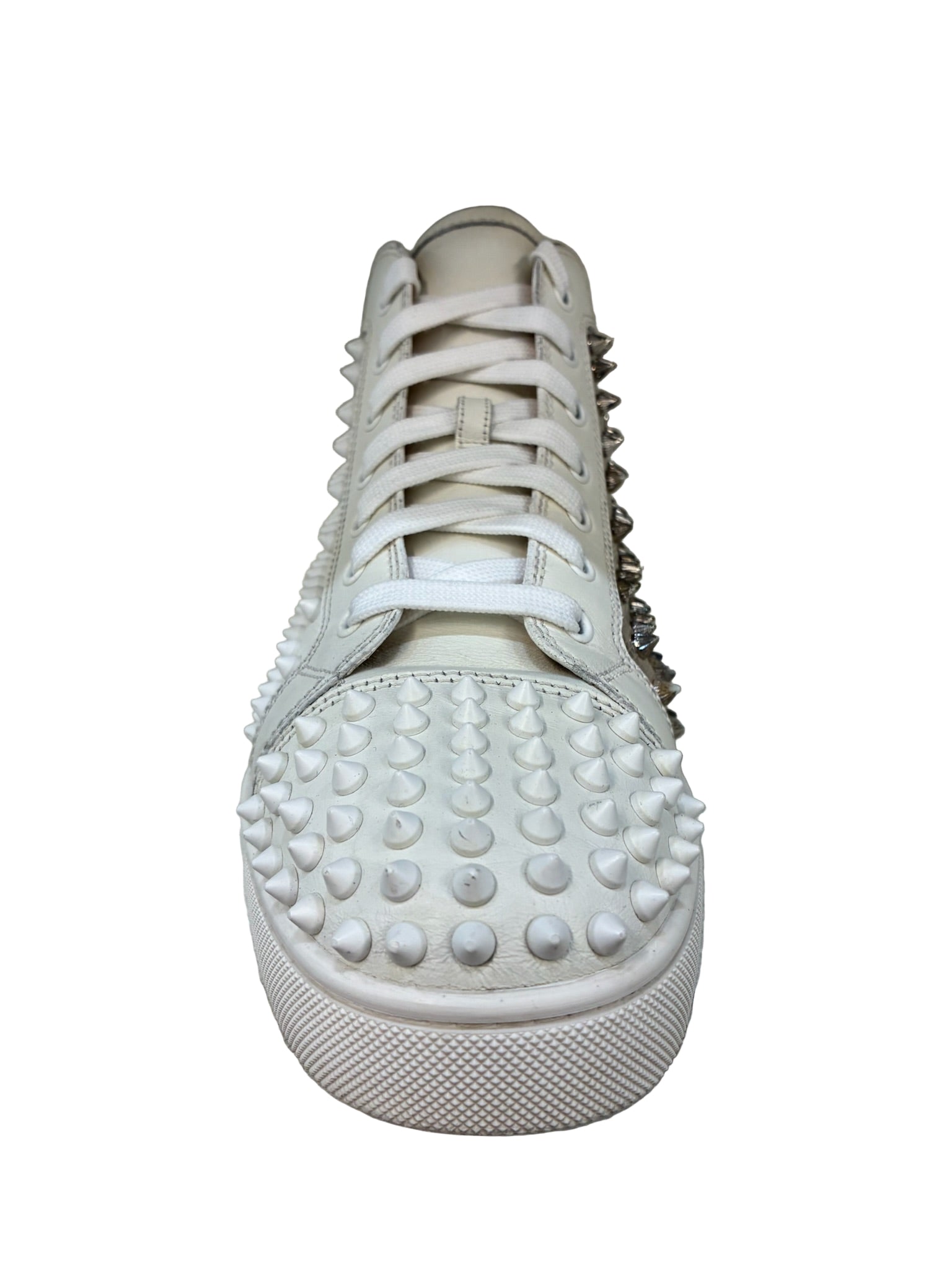An iconic statement piece from Christian Louboutin, the Louis Spikes high-top sneakers showcase the brand’s signature mix of elegance and edge. Crafted from premium white leather, these sneakers feature the house’s hallmark spike embellishments across the toe box, side panels, and heel — a bold reflection of Louboutin’s avant-garde aesthetic. The clean silhouette and meticulous construction highlight the brand’s attention to detail and luxury craftsmanship.