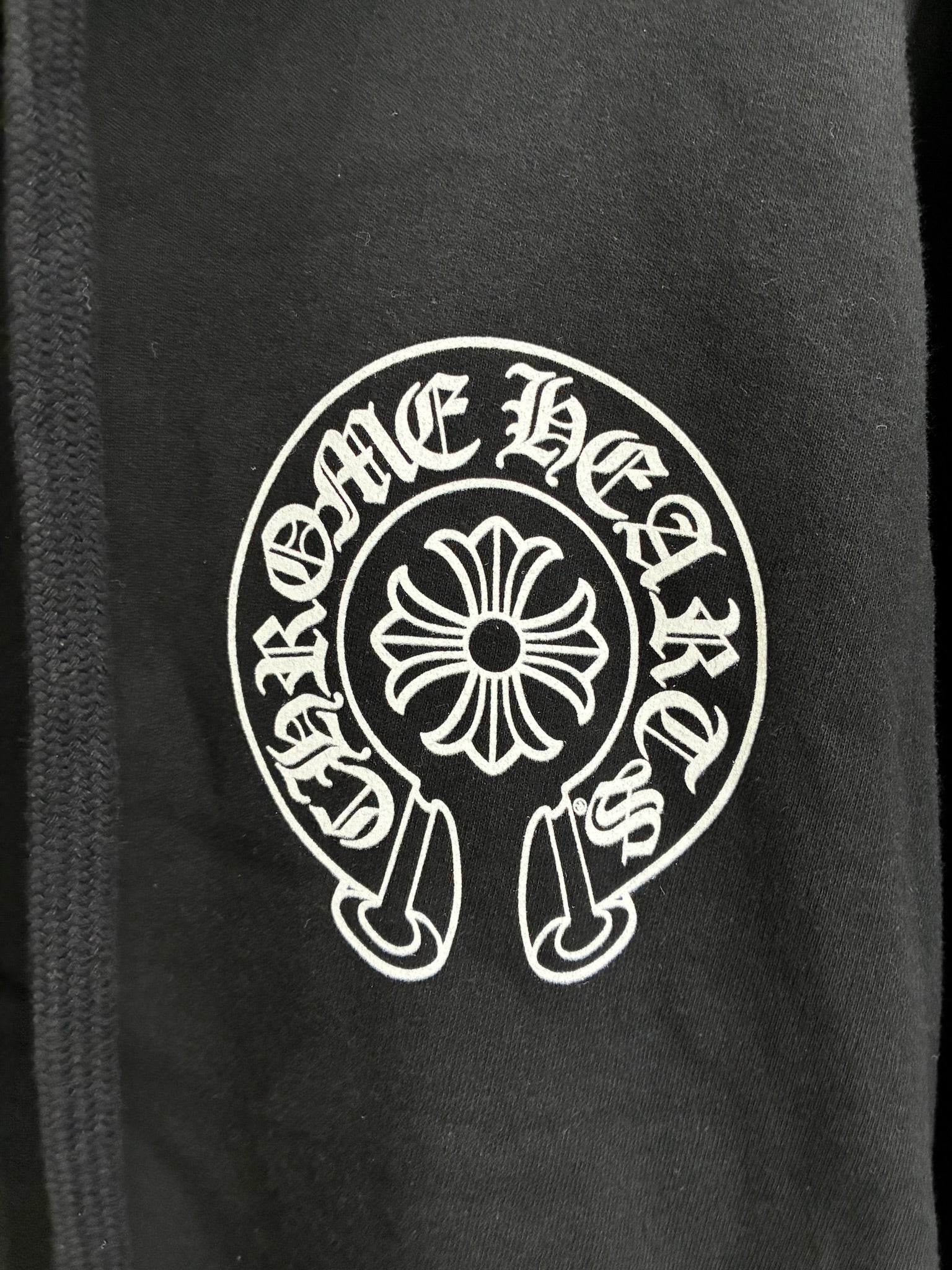 • Front: Classic Chrome Hearts horseshoe logo and cross graphic on the chest