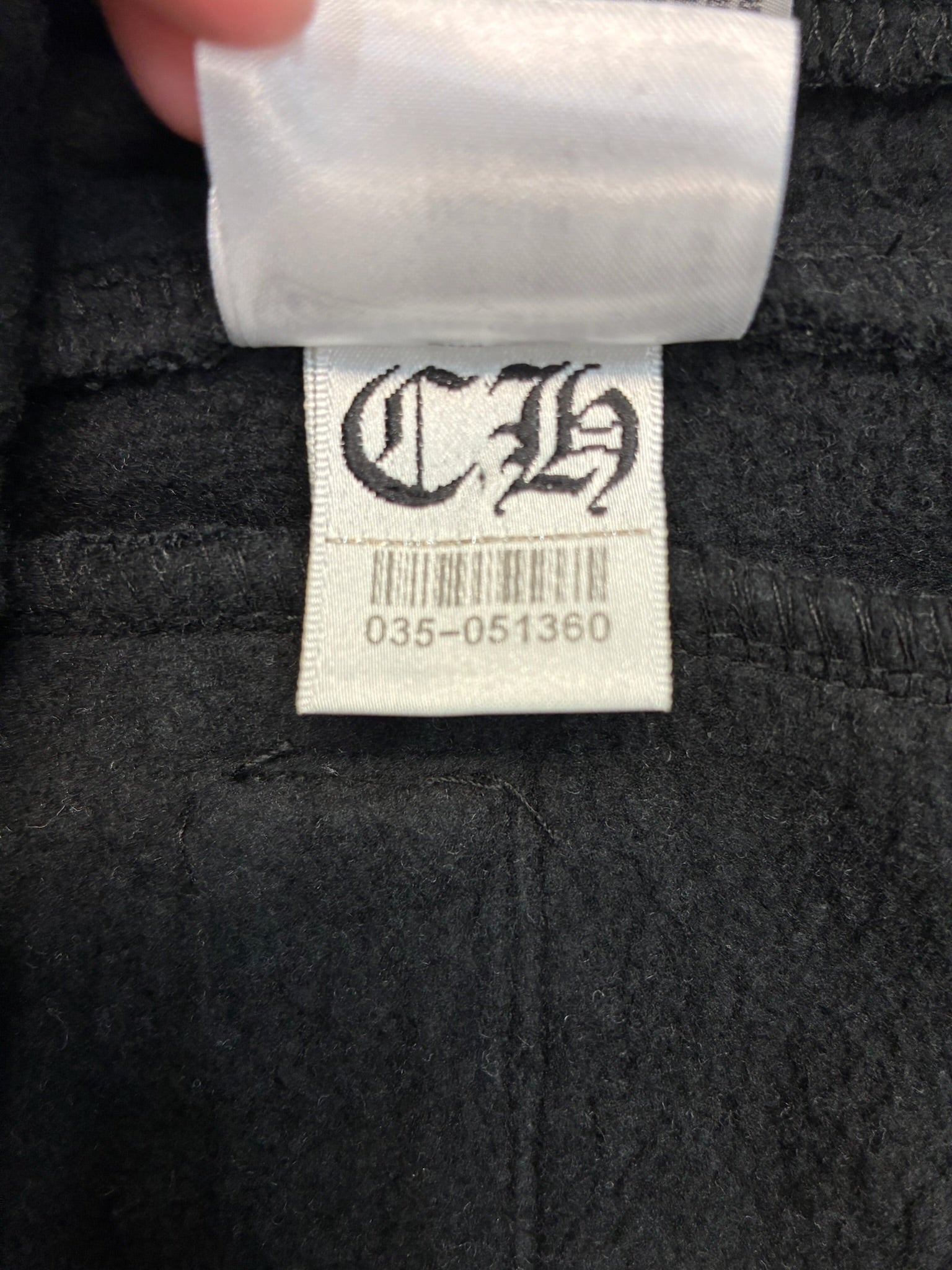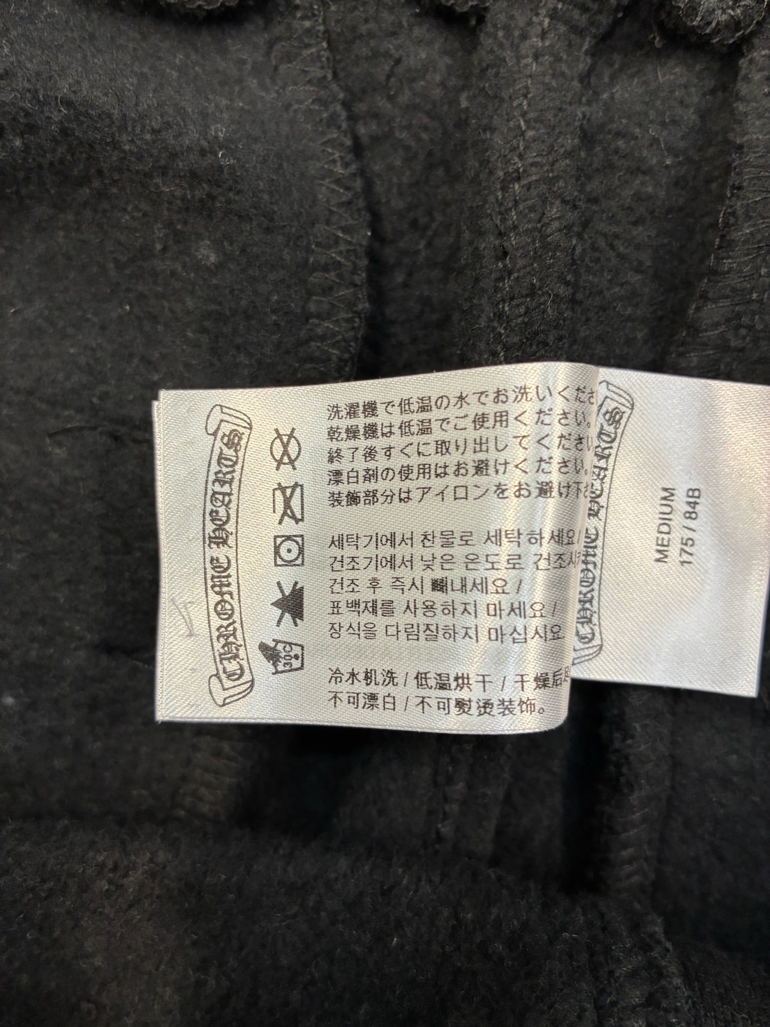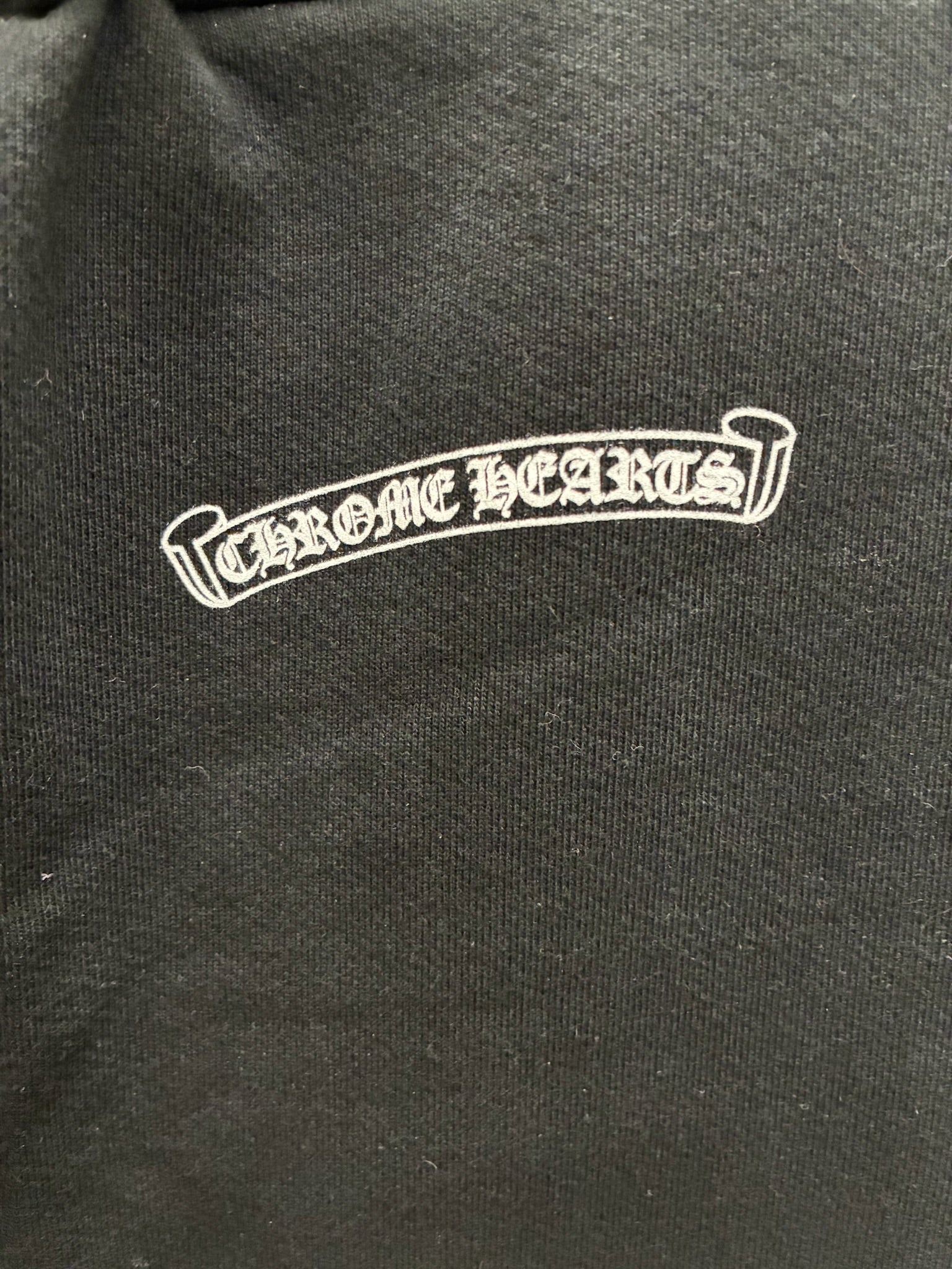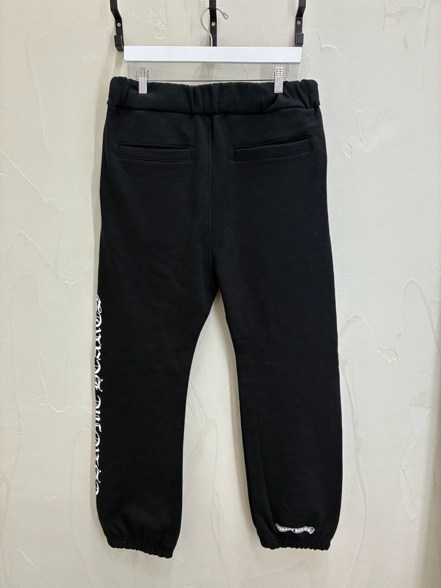 • Details: Elastic waistband with drawstring; ribbed ankle cuffs; Chrome Hearts logo print down both legs; embroidered crest at hip; tonal “CH” embroidery near pocket