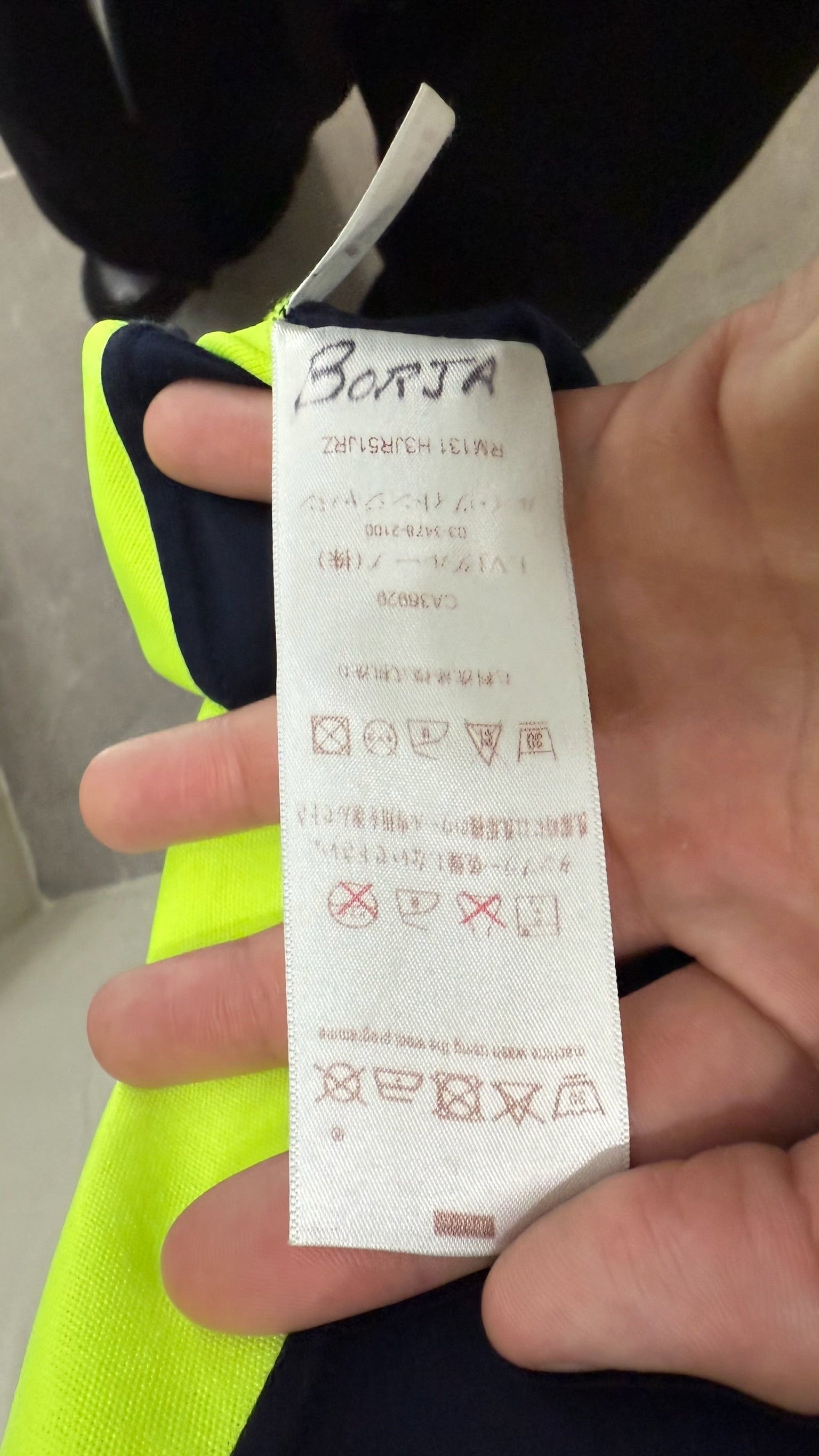 • Color-blocked design with deep navy base and vivid neon yellow panels along the sides and shoulders — a signature Kim Jones touch that nods to high-performance athletic wear.