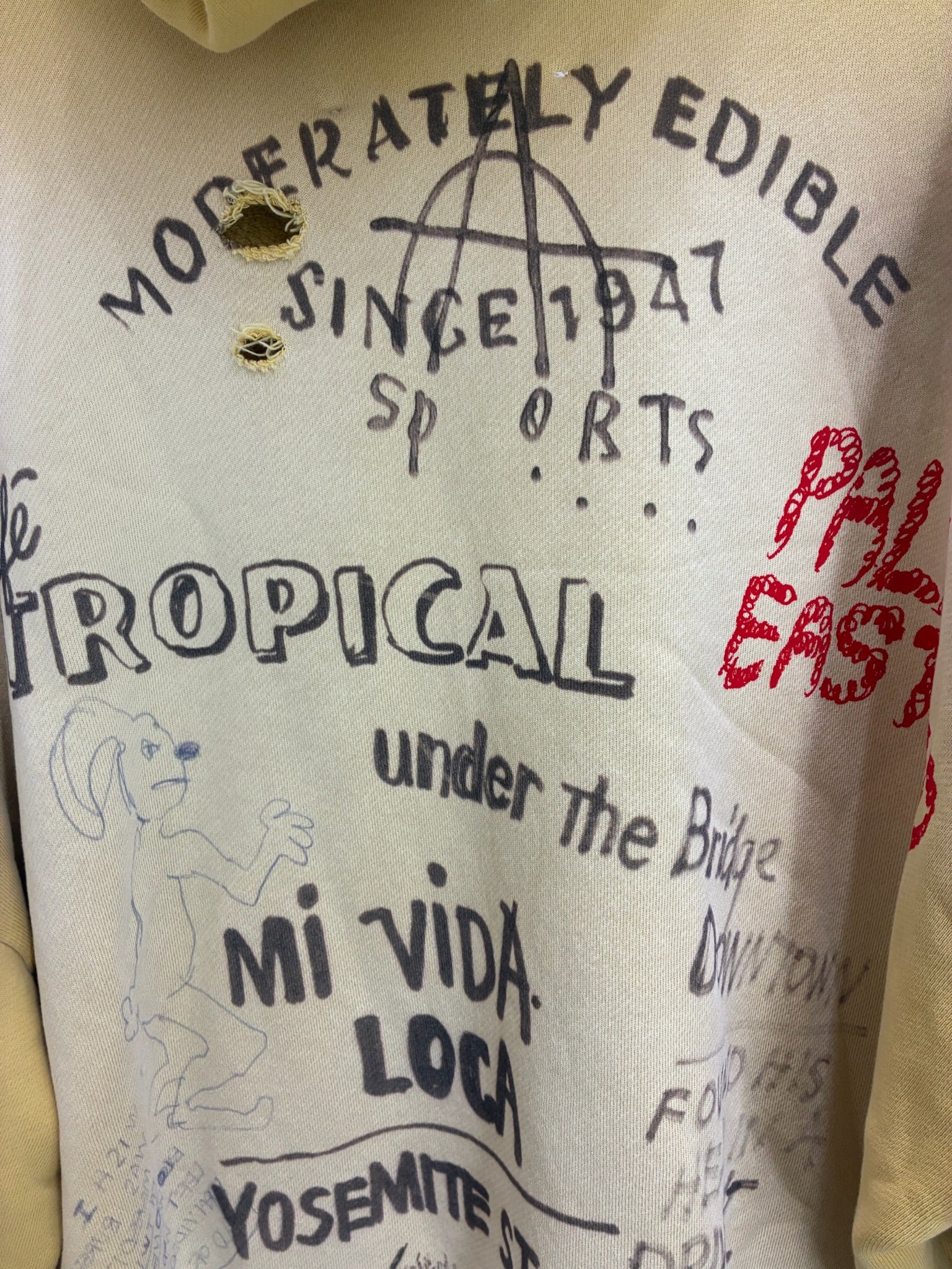 A standout piece from PALY, this Yellow ‘EPDS’ Hoodie blends distressed streetwear aesthetics with elevated craftsmanship. Crafted from heavyweight cotton, the hoodie features hand-distressed detailing throughout for a lived-in, vintage-inspired look. The front showcases the bold “E.P.D.S.” graphic with an original illustrated design — a hallmark of the brand’s artistic, subversive style.