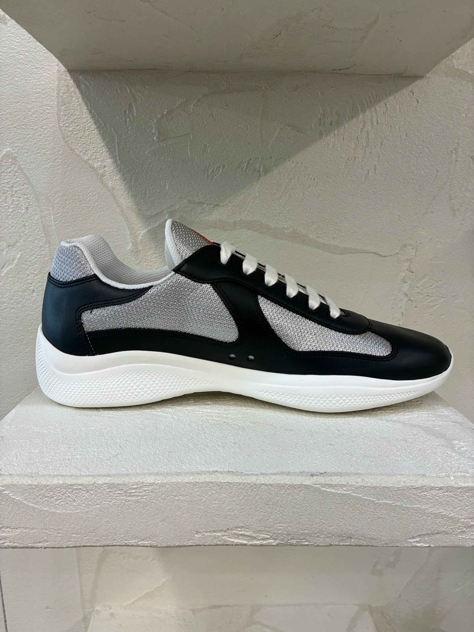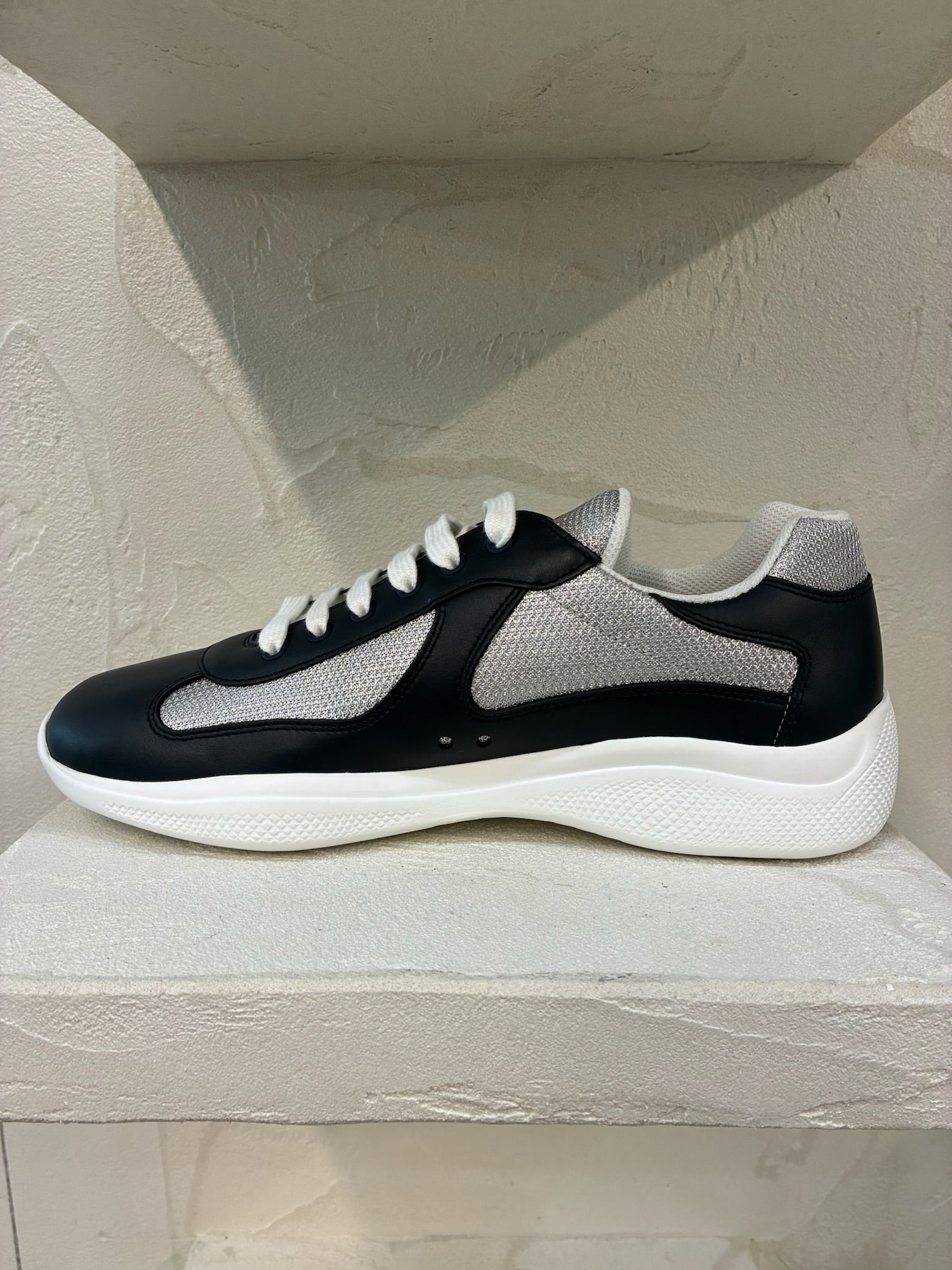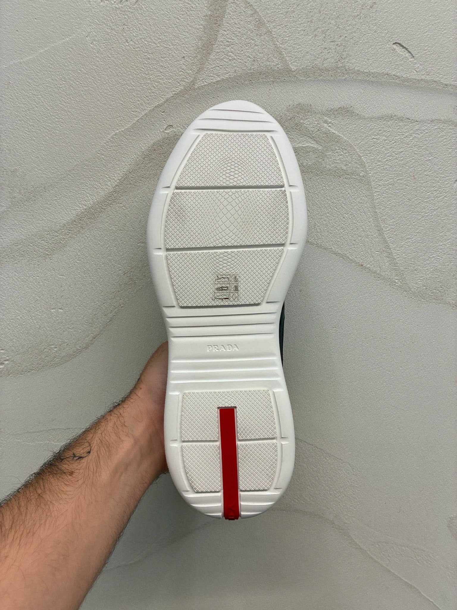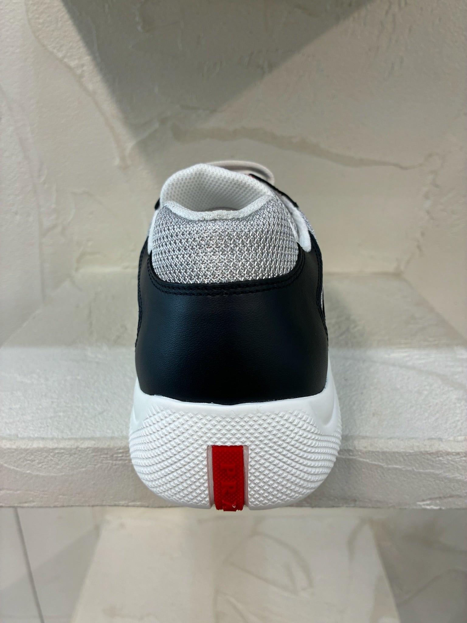 A refined iteration of Prada’s iconic America’s Cup silhouette, this pair combines deep navy leather panels with light grey technical mesh for a sophisticated, versatile aesthetic. The smooth leather upper offers a sleek, understated look, while the breathable mesh provides enhanced comfort and airflow. Prada’s hallmark red logo tab adorns the tongue, delivering instant designer recognition, and the white rubber sole offers a clean contrast with dependable traction.