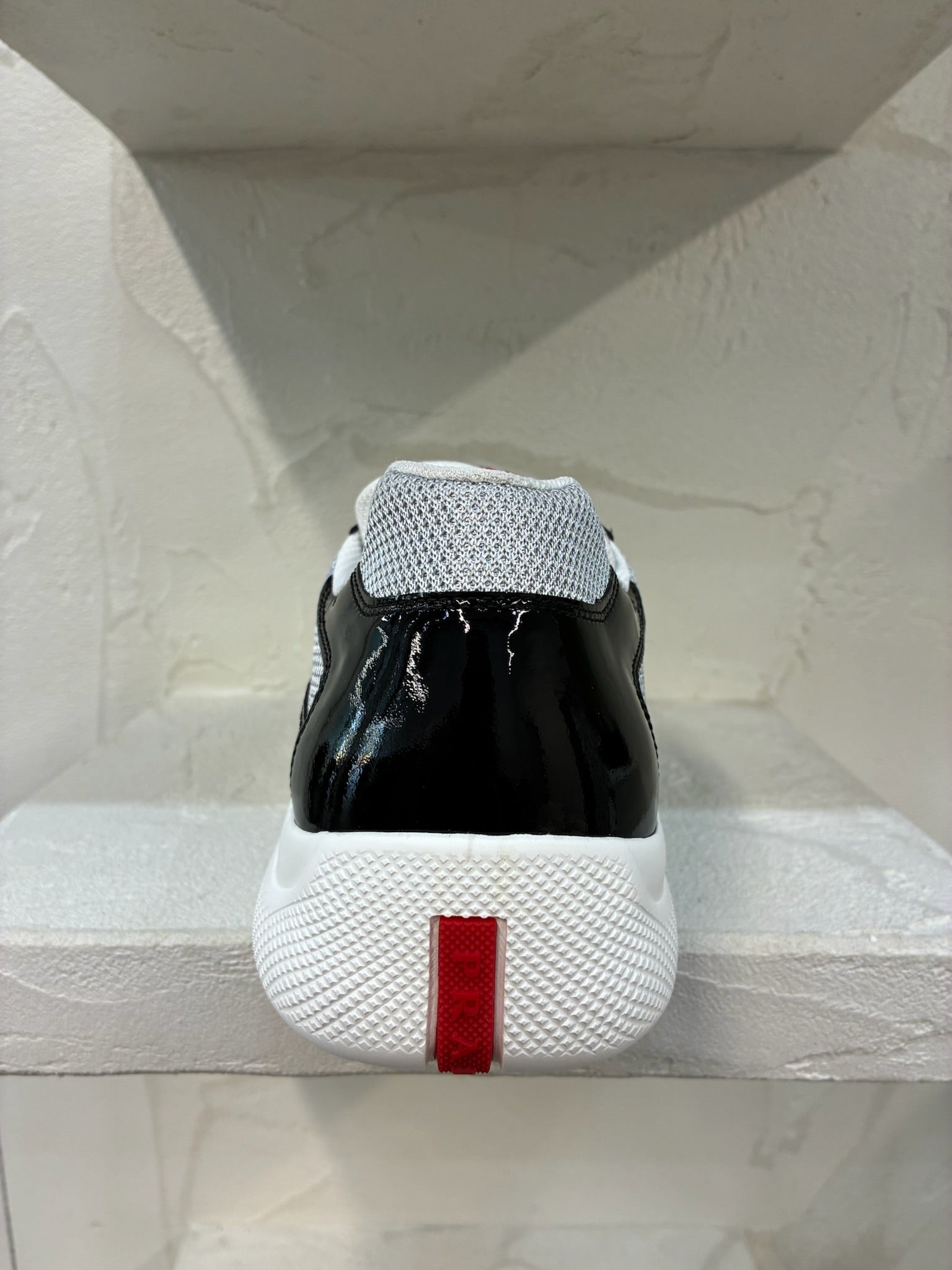 Featuring glossy black patent leather paneling contrasted with breathable silver mesh, these sneakers deliver a bold, polished look while maintaining exceptional wearability. The cushioned lining and durable rubber sole make them practical for daily wear, while the iconic red Prada stripe adorns the tongue for an unmistakable finish.