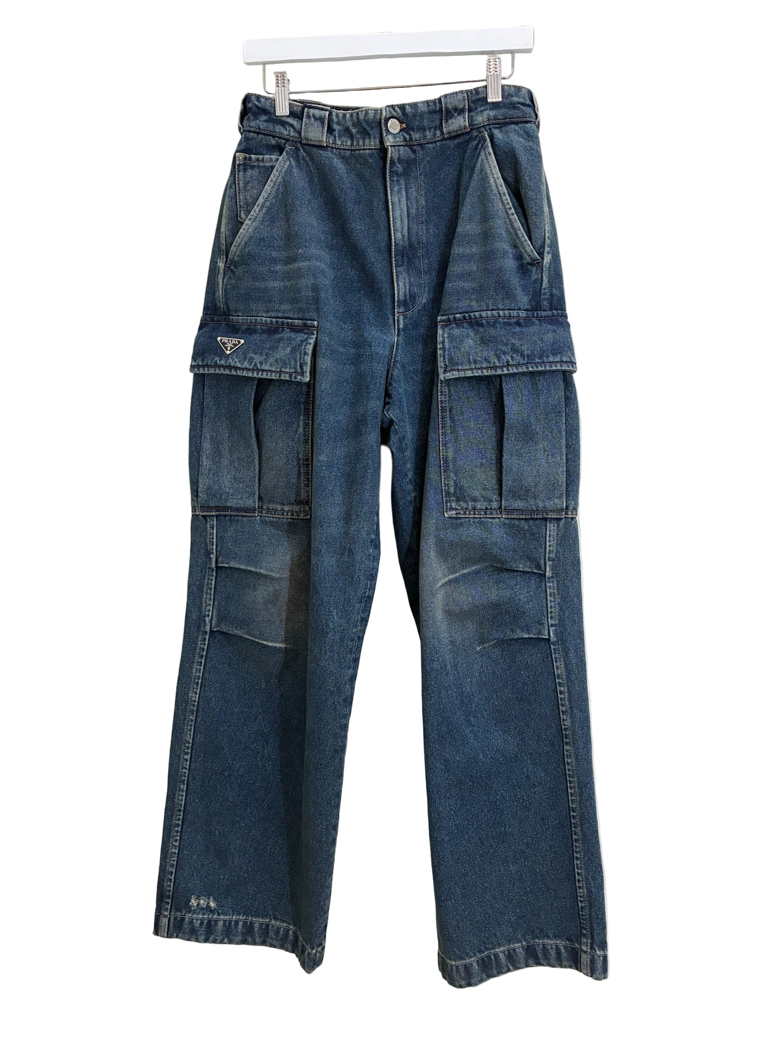 The design features a mid-rise waist and wide straight-leg cut, giving the piece a casual yet refined drape. Distressed fading throughout adds subtle texture and depth, while oversized cargo pockets on both thighs provide a bold, practical element. The signature Prada enameled triangle logo is discreetly placed on the left cargo flap, serving as a hallmark of understated sophistication.